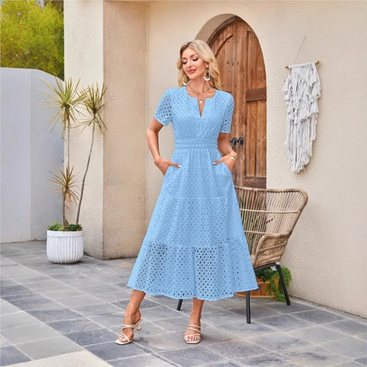 2024 Summer Elegant Women Sexy V Neck Bohemian Long Dress Floral Print Party Dress Tie-up Short Sleeve Hollow Maxi Dresses