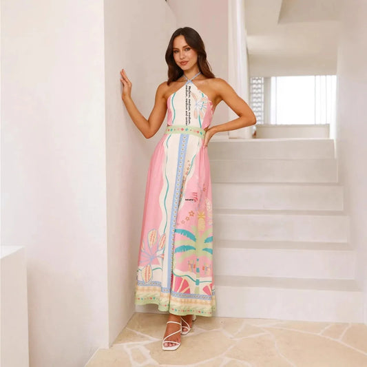 Chic Printed Backless Halter Dress Lace Up Slimming Maxi Dresses High Waist Party Robes 2025 New Lady Vacation Party Clothing