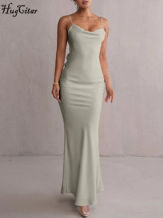 Hugcitar Elegant Satin Solid Slips Backless Tie Flowers Draped Sexy Slim Maxi Dress Spring Women Y2K Clothes Birthday Vacation