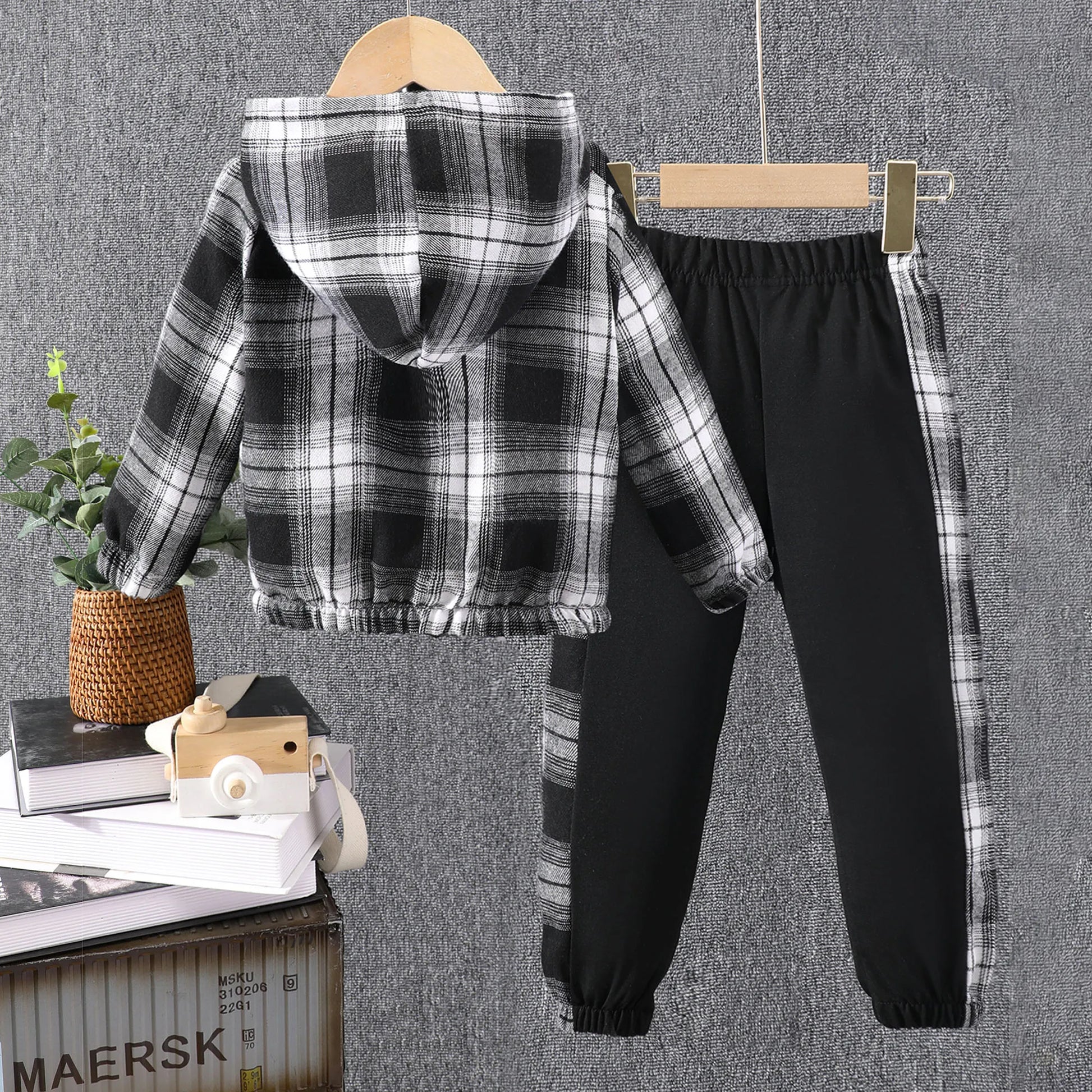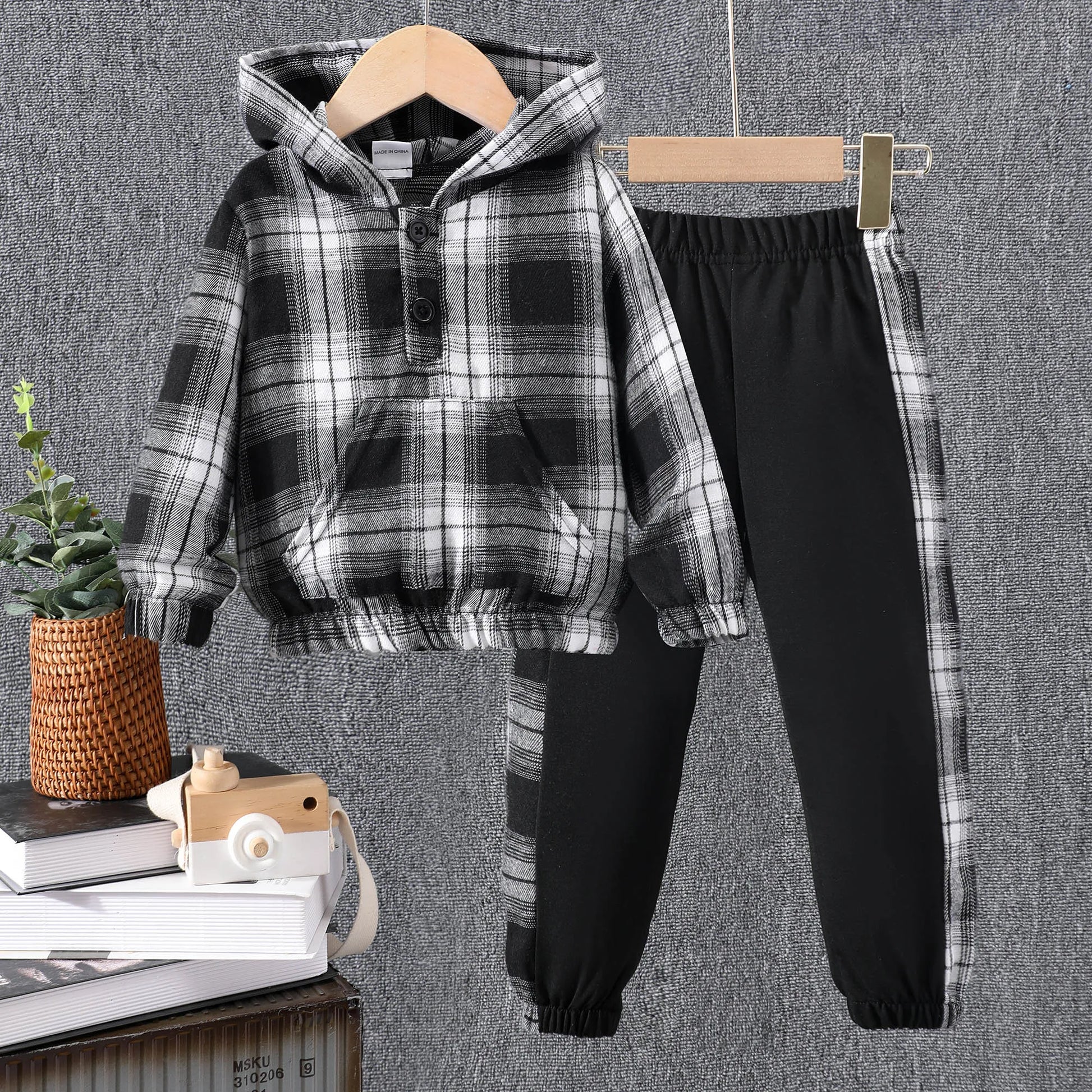 2pcs Boy's Plaid Button Hooded Outfit, Hoodie & Pants Set, Boys Clothes, As Gift