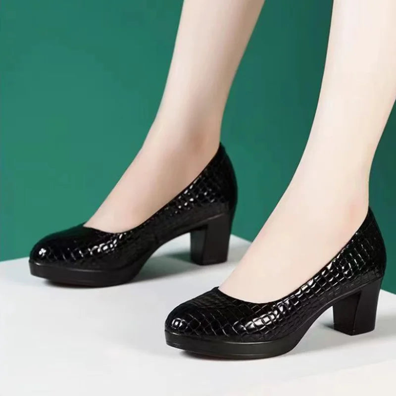 sapatos femininas women fashion round toe black plaid pattern slip on chick high heel shoes lady casual white work pumps a411