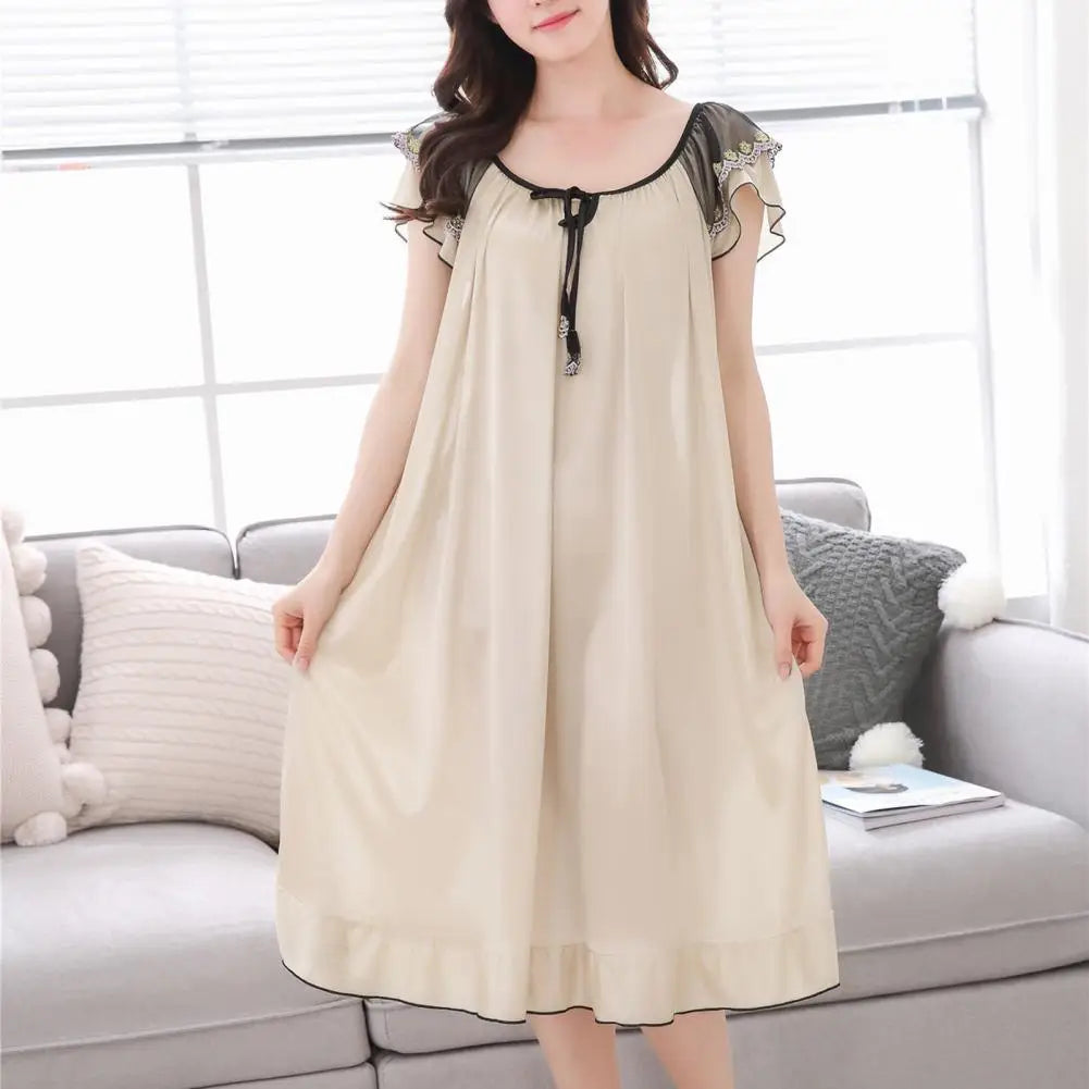 Sleeping Dress for Women Night Gowns Sleepwear Lace Long Sleeping Dress Casual Satin Ruffle Hem Summer Nightdress Pajama Dress