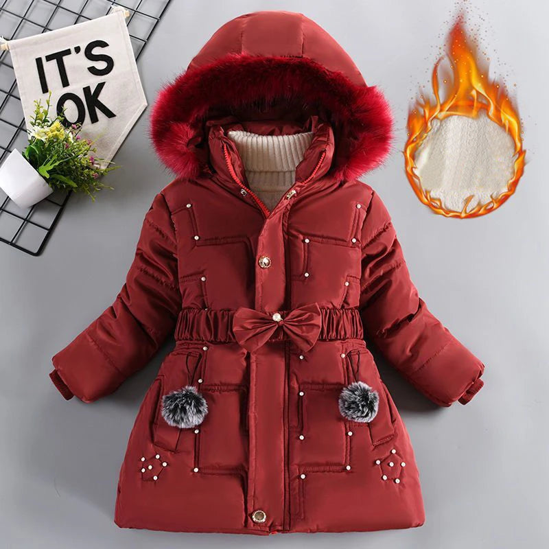 Winter Girls' New Nail Bead and Plush Thickened Waist Hair Collar Hooded Fashionable Windproof and Warm Cotton Jacket